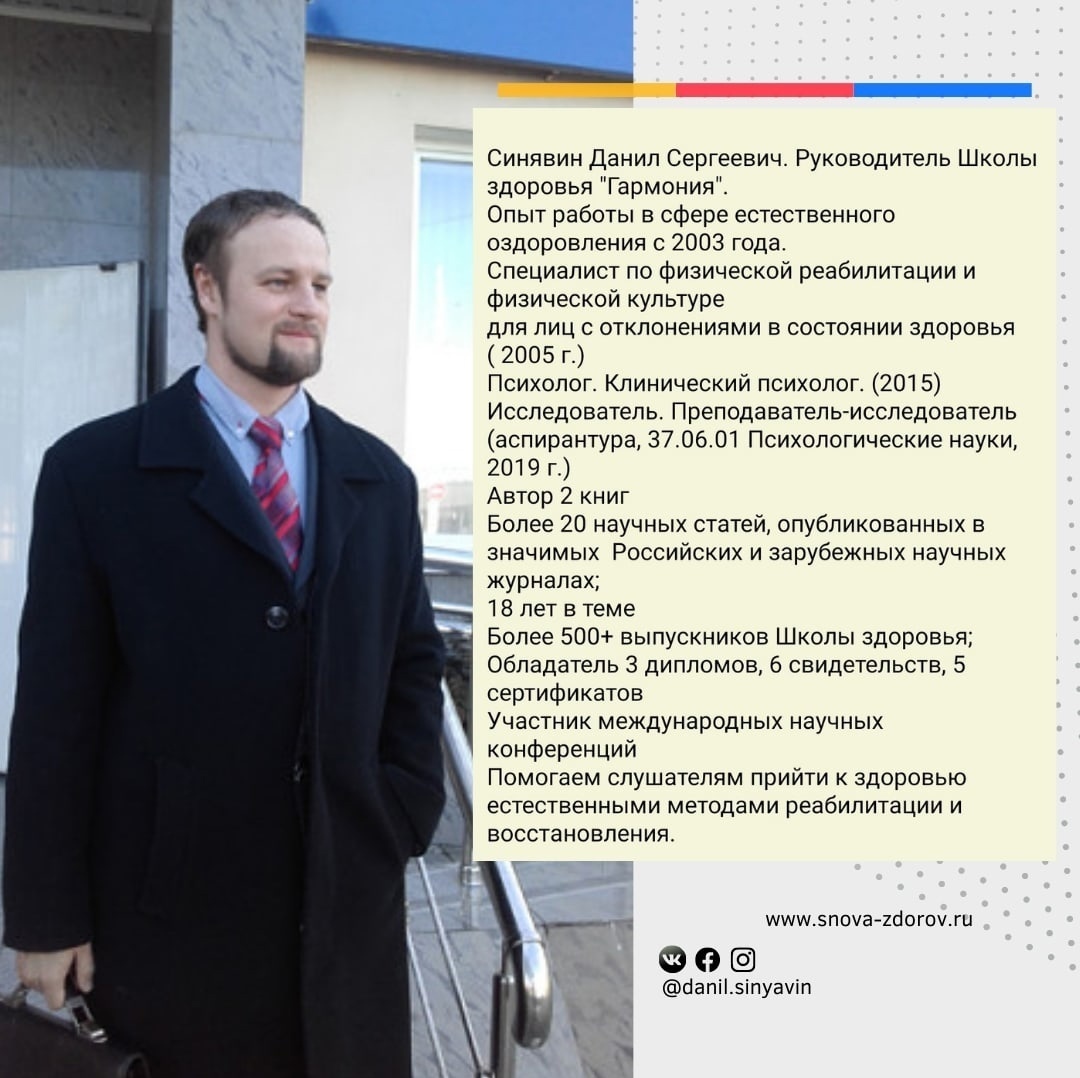 Данил Сергеевич Синявин. Реабилитолог, клинический психолог. Руководитель Школы здоровья "Гармония". Стаж с 2003 г.